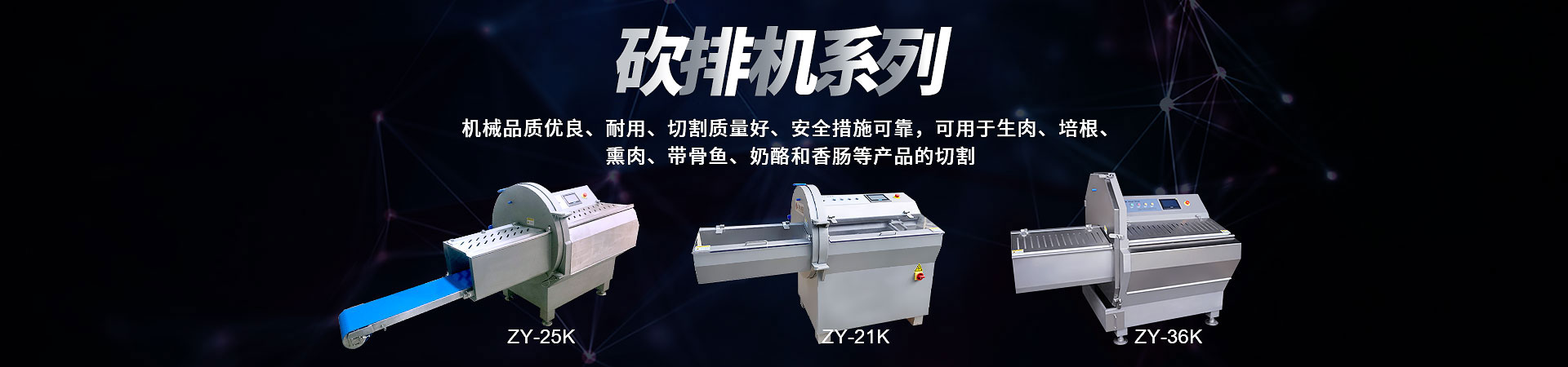 切肉機(jī)、鋸骨機(jī)、砍排機(jī)、凍肉切丁機(jī)、去豬皮機(jī)、牛肉去筋膜機(jī)